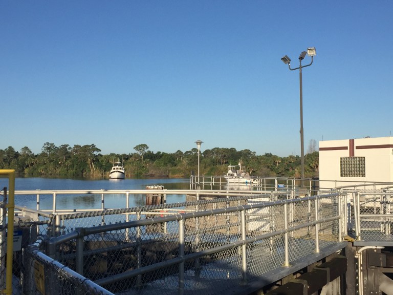 The lock system is so interesting ! I was able to walk to the top of the lock and observe the process from above on my morning walk at The St Lucie Lock. This would be our fifth lock and this time we are dropping 14 feet. By the time I got back to the boat they were ready for us to enter.