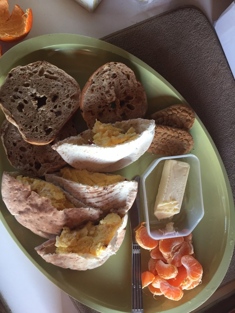 I cook in my insta pot and the electric skillet, or Mac grills on the green egg or gas grill on the flybridge. Typically I cook breakfast before we pull anchor but often Mac will single hand the morning duties and I get to sleep in. He always starts the generator to make coffee and once I stumble out and get a cup in me I’ll cook him something. It’s usually an easy to serve, hand held, bacon egg and cheese in a pita pocket or tortilla. Lunches while underway might be just crackers with summer sausage and cheese or a dip with carrots and fruit. Light and easy to serve between us at the helm.