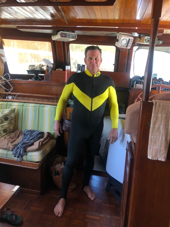 Now I can’t lie. My job is easier than the skippers. He has been under water scrubbing the bottom of the Pelican and the dinghy for two days. The props are pretty crusted over with growth and he can’t crank the engines until he checks all the exhaust intakes. He finds our zincs are pretty bad so he’ll be down there again tomorrow I suppose. Yes, I know, these are first world problems. But the few days after one returns to the boat are filled with not-so-pleasant tasks. The good news is the heat moved out last night and there is a lovely north breeze today enabling us to open her up and let the fresh air blow through. I’m thinking Fall might just be peeking around the corner!