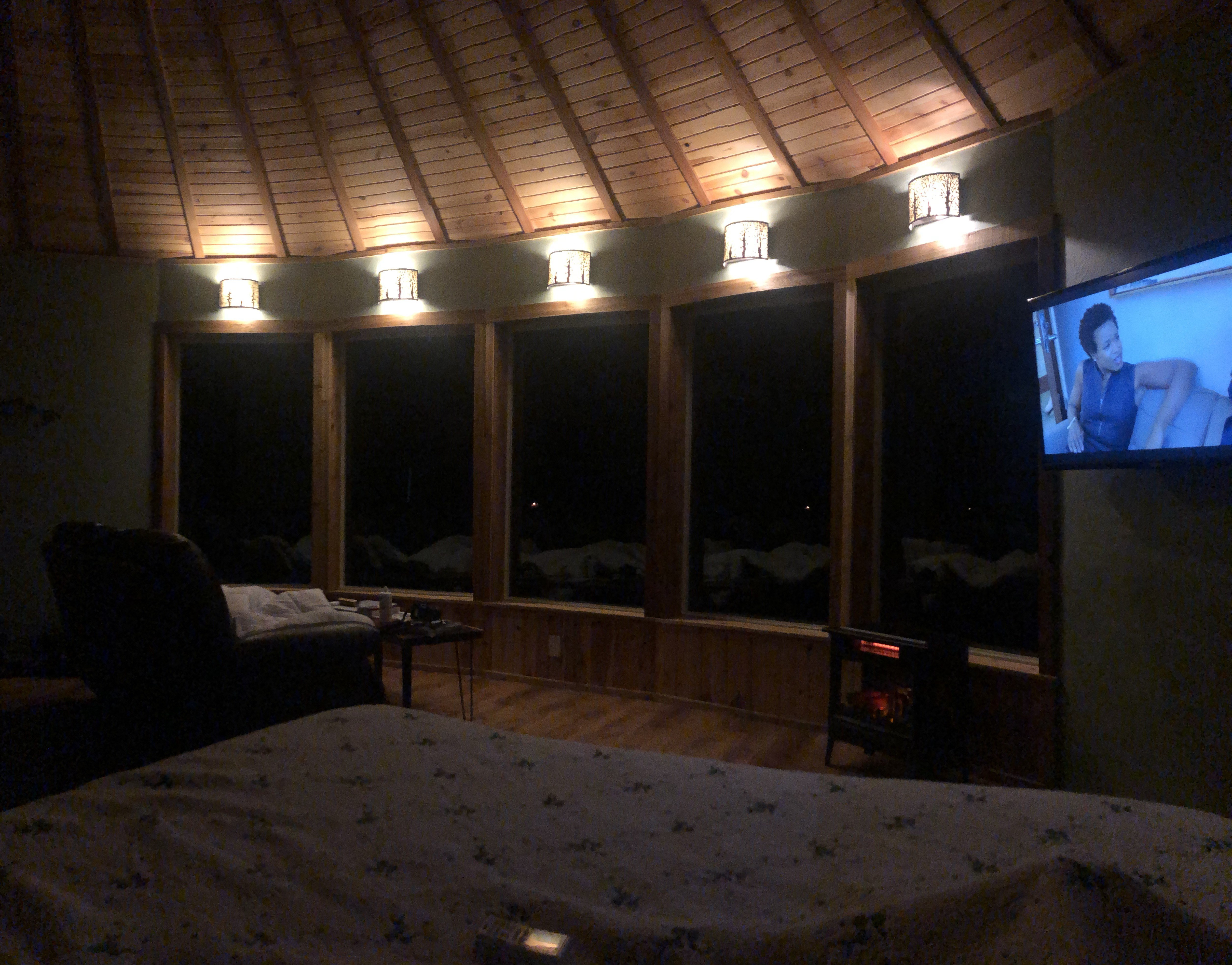 Carla and I took a road trip this week being hosted by her cousin in his wonderful cozy Yurt. Every board, every railing, every countertop has been crafted with loving care by Blake’s hands. It’s truly a work of art. The structure is round with windows stretching the entire back of the Yurt overlooking a wooded ridge. Its peaceful here. Uncomplicated. There is a respect for the surrounding land, lakes and wildlife. Birds lite on the railings just long enough to let you admire their amazing individuality. Belle and Bear, Blake and Melissa’s beautiful great pyrenees pups greet you in eager anticipation of a belly rub.